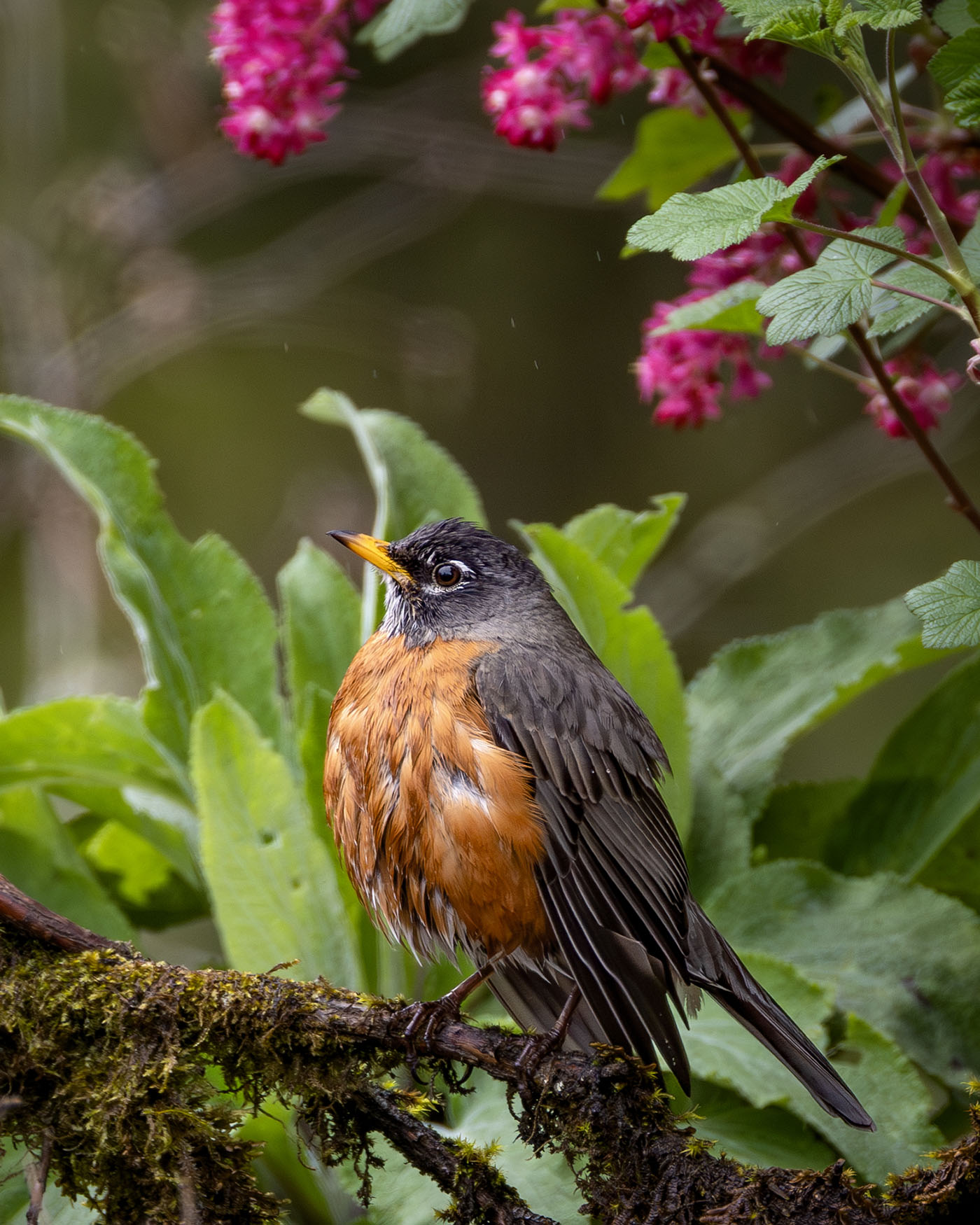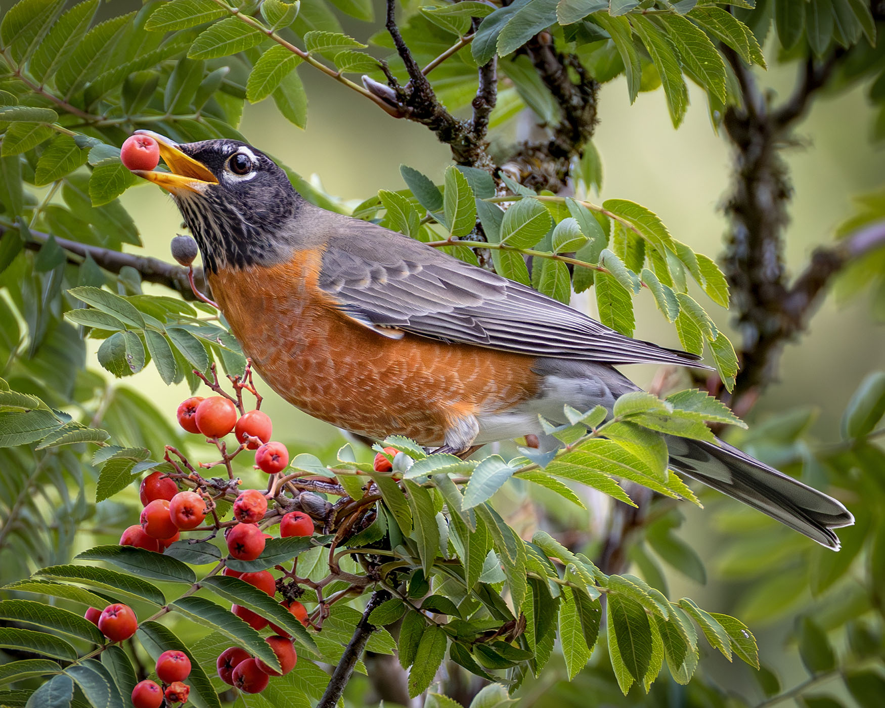 American Robins live year round in my area. A pair or two will overwinter with the greater number migrating back into the watershed in early spring. Large flocks gather, at the beginning of each year, throughout the top of one of the taller trees in the canopy above the creek as if to assess their number. They descend en masse to forage in the lawn or empty the birdbath with their overcrowded and vigorous splashing. They soon disperse with several pair remaining in the neighborhood throughout the summer.
