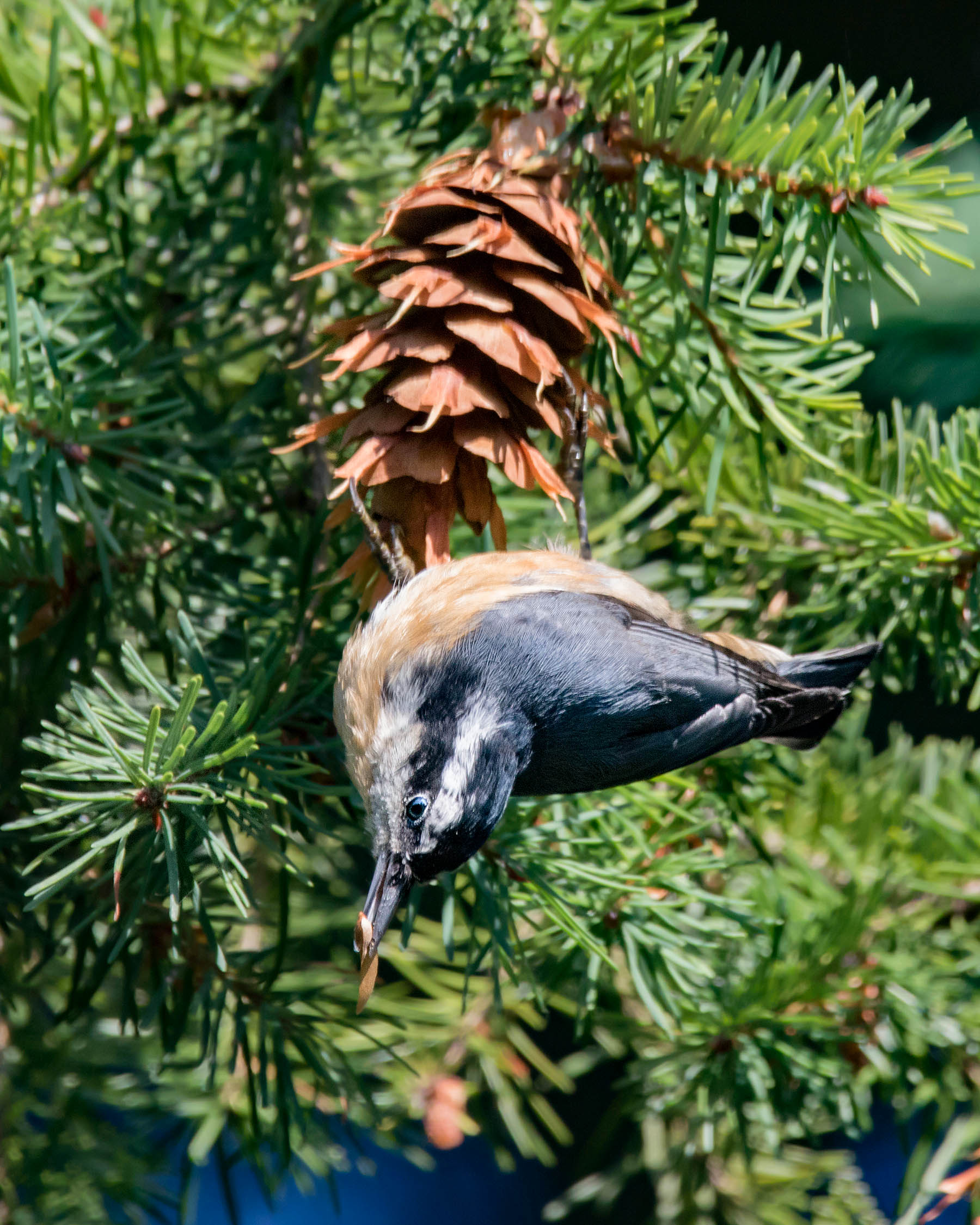 Red-breasted Nuthatches are one of the most frequent visitors to the area. Their diligence is impressive with mated pairs running relays from the feeders to their nests. Their acrobatics are a joy to see.